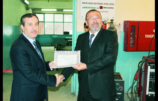 Okul Müdürü Seyfettin Doğan; metal teknolojisi alanını, oksi-gaz ve diğer ileri teknoloji kaynak atelyesini, modern yapıya büründüren, Eczacıbaşı Lincoln Electric Askaynak ve Emin Elektrik San. Tic. A.Ş. ye teşekkür ederek plaket verdi.