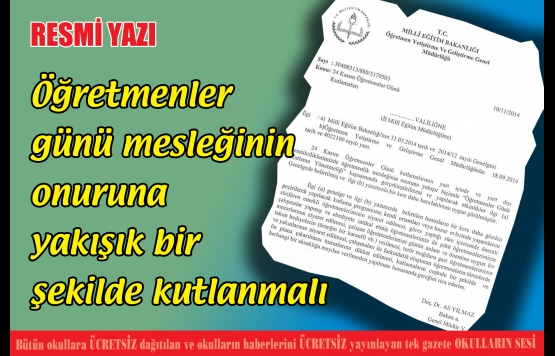 Milli Eğitim Bakanlığı Öğretmen Yetiştirme ve Geliştirme Genel Müdürlüğü, Milli Eğitim Müdrülüklerine 24 Kasım Öğretmenler Günü kutlamaları ile ilgili resmi bir yazı yayınladı.